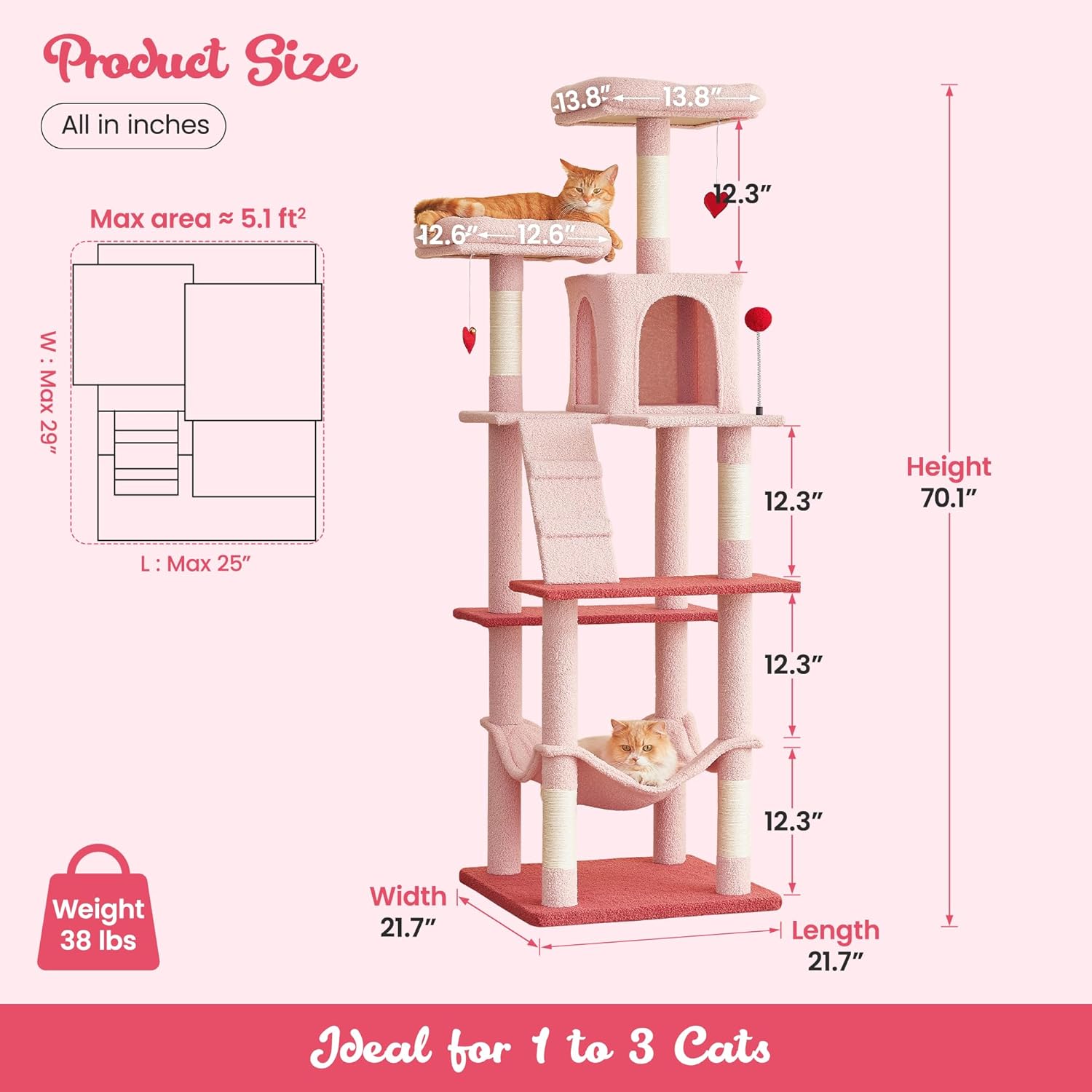 - Larger Cat Playground: Designed to offer even more space for your cat to explore and play. This bigger cat tree features two heart-shaped dangling balls. Its unique design will easily attract your cat