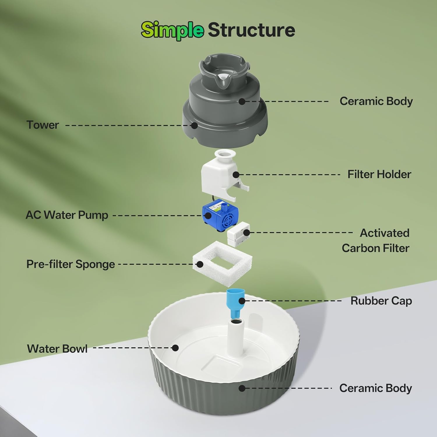 - 😽【Multi-Filtration, Water Purification】: Equipped with activated carbon filter and pre-sponge filter, which can remove sediment, debris and pet hair, this ceramic pet water dispenser can provide a constant supply of flowing purified water. Note: It is healthier to change the filter every 4 weeks!