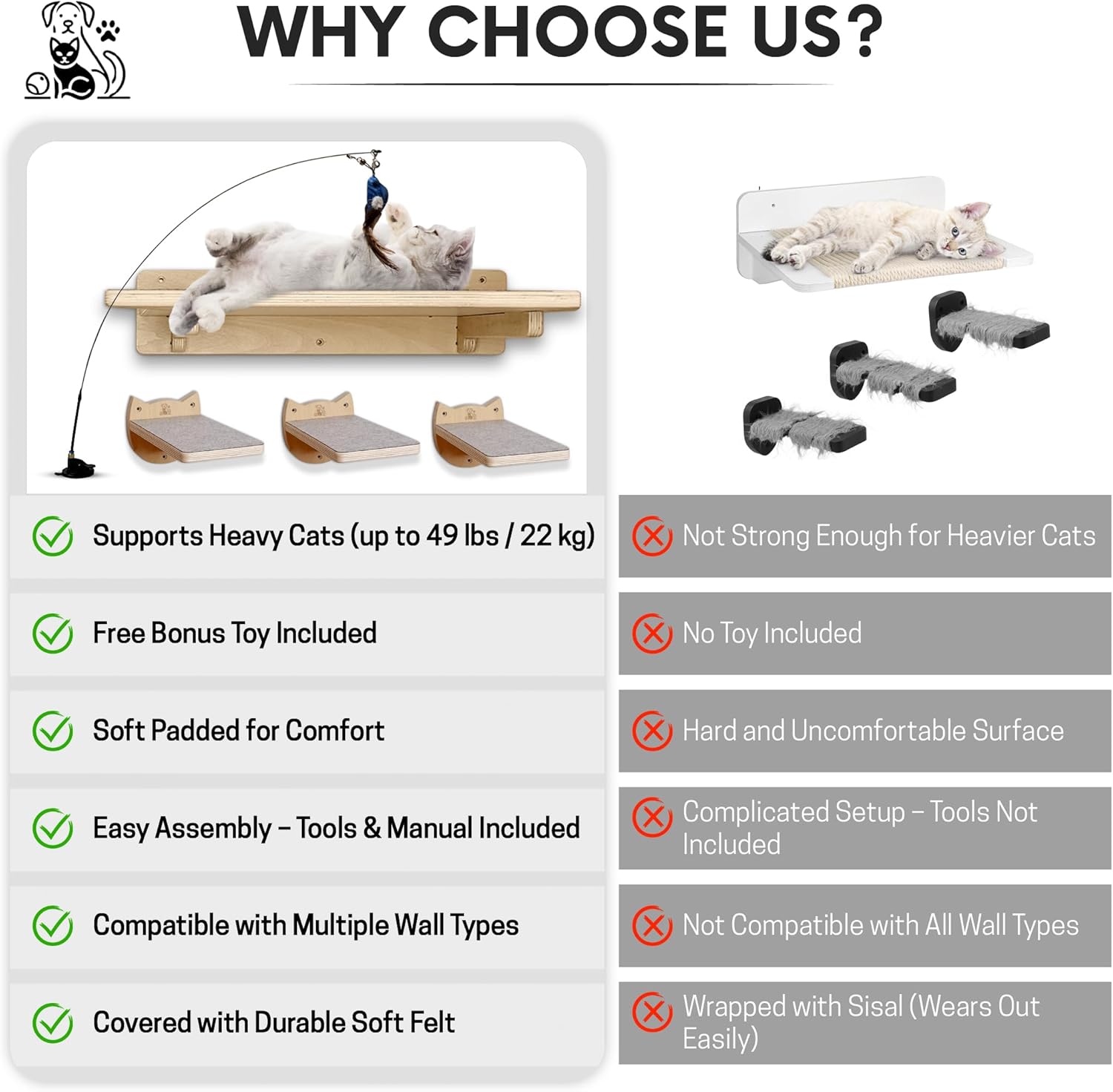 - Transform your wall into an adventure zone with our cat wall shelf system, including 3 climbing steps and 1 wide lounging shelf. Whether your cat loves to jump, perch, or nap, this vertical setup keeps them engaged and happy all day long.