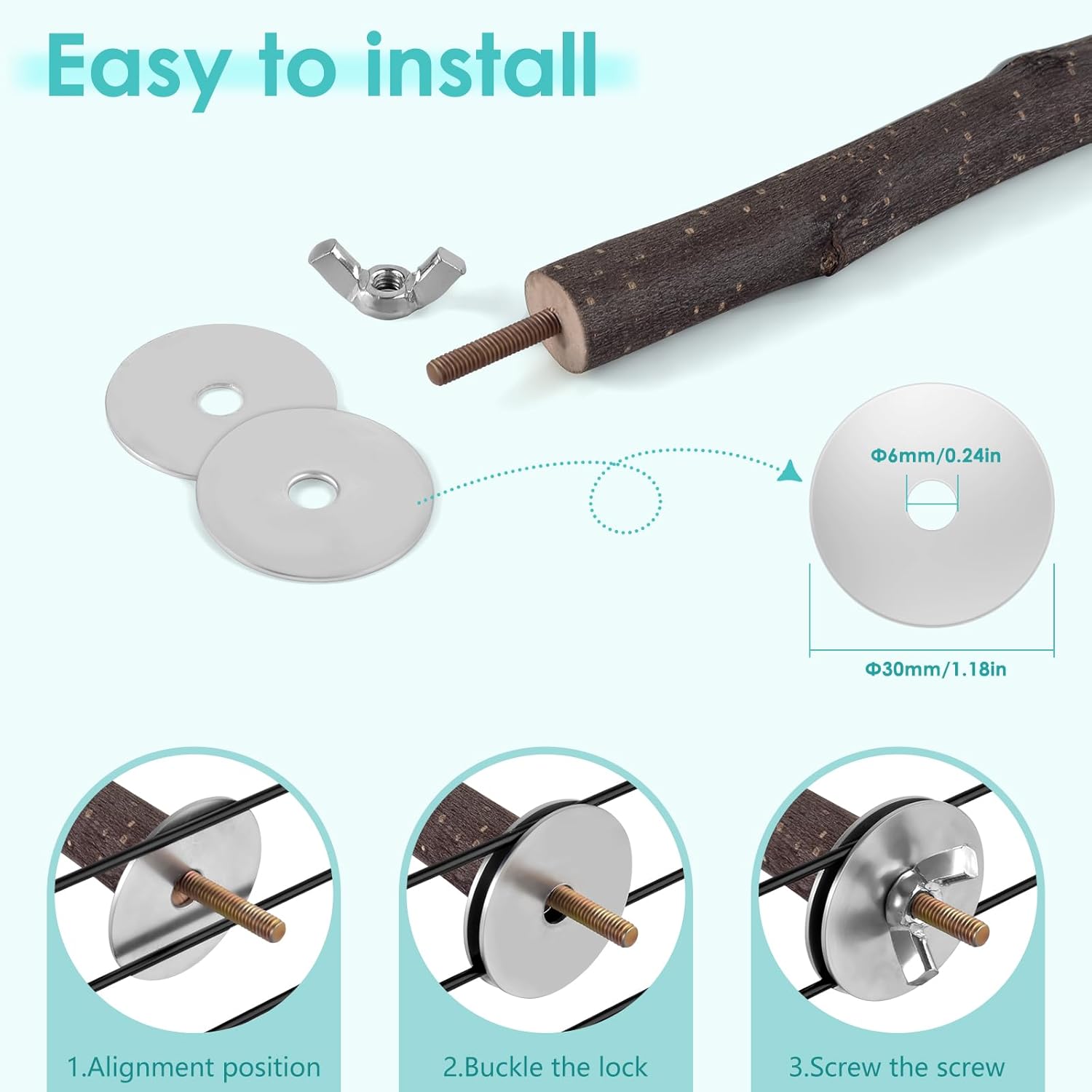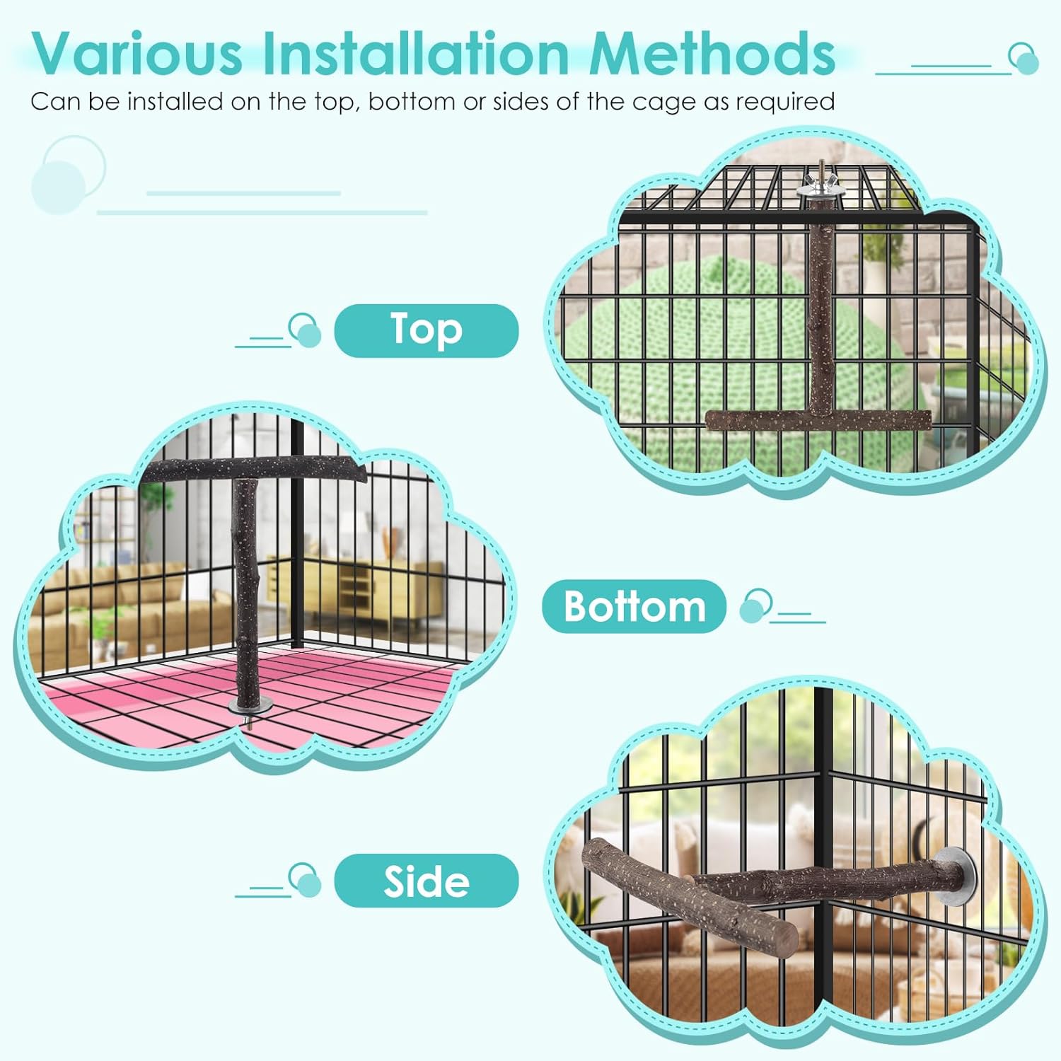 - Easy to Install: Each parrot cage perch stand comes with metal wing nuts and built-in bolts that securely fasten to the inside and outside of the bird cage, eliminating the need for additional mounting equipment. This provides additional living and landing space for parrots and creates a natural habitat