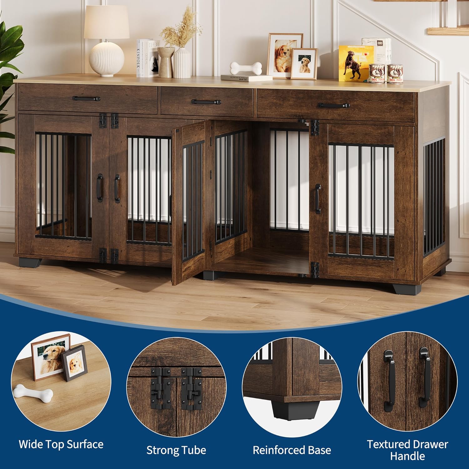 71 Inch Dog Crate Furniture for 2 Rooms, Wooden Double Crate Large Breed with Door, Dog Kennel Indoor, TV Stand End Table with Divider for Large Medium Dogs,Brown