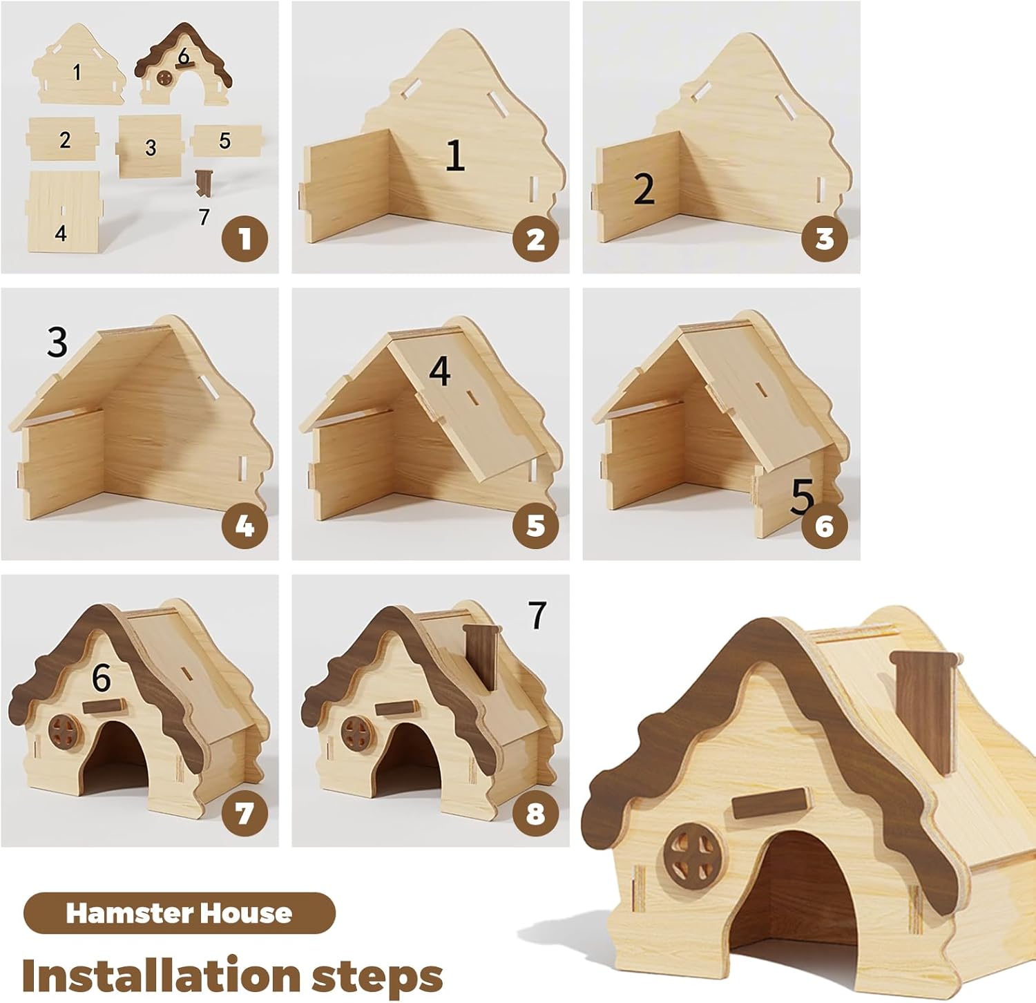 - Wooden Hamster Castle: The hamster hideaway features a double-layer structure design and 2 independent hamster hides. It also allows you to flexibly adjust the layout according to personal preferences or pet need, increasing the diversity and enrichment.This gerbil house is made of natural wood and has no peculiar smell. Every corner is polished smoothly to avoid scratching pets. It brings a chew able and safe hamster hut for syrian hamsters.