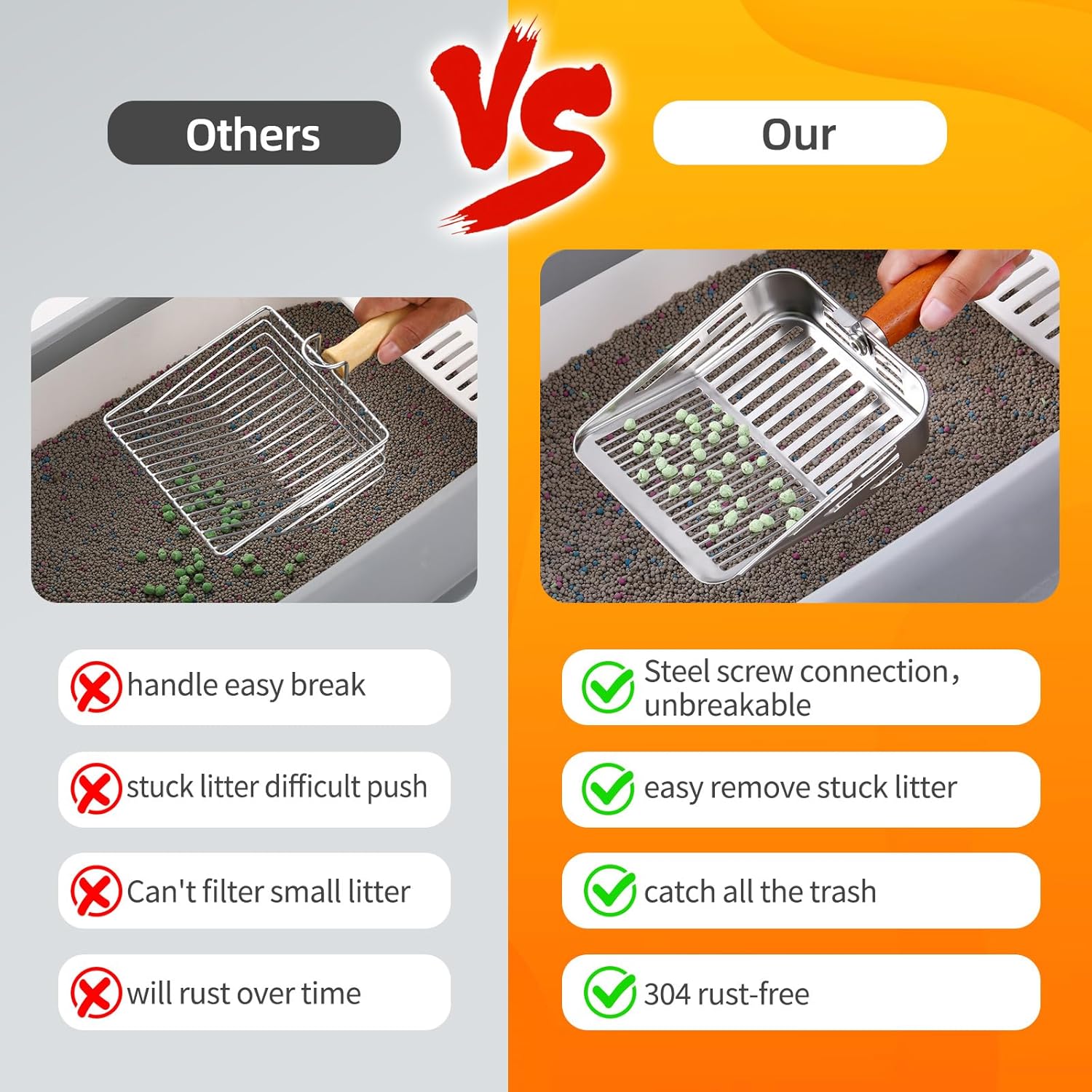 - [Durable 304 Stainless Steel Litter Scoop] Made with 0.7mm thick 304 stainless steel, this cat litter scoop is rust-resistant, sturdy, and long-lasting. The one-piece stamped metal litter scoop design has no weld spots, making it stronger and more reliable than plastic or welded scoops.