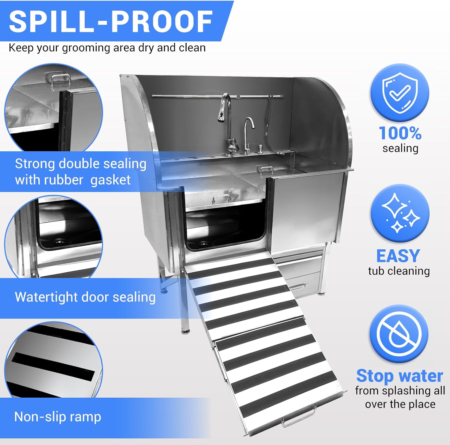 - Spacious Tub with Smart Storage: 38”x30.7”x58.7” size fits all dog breeds. Includes a large sliding drawer to organize towels, shampoos, and grooming tools for a clutter-free bathing area.