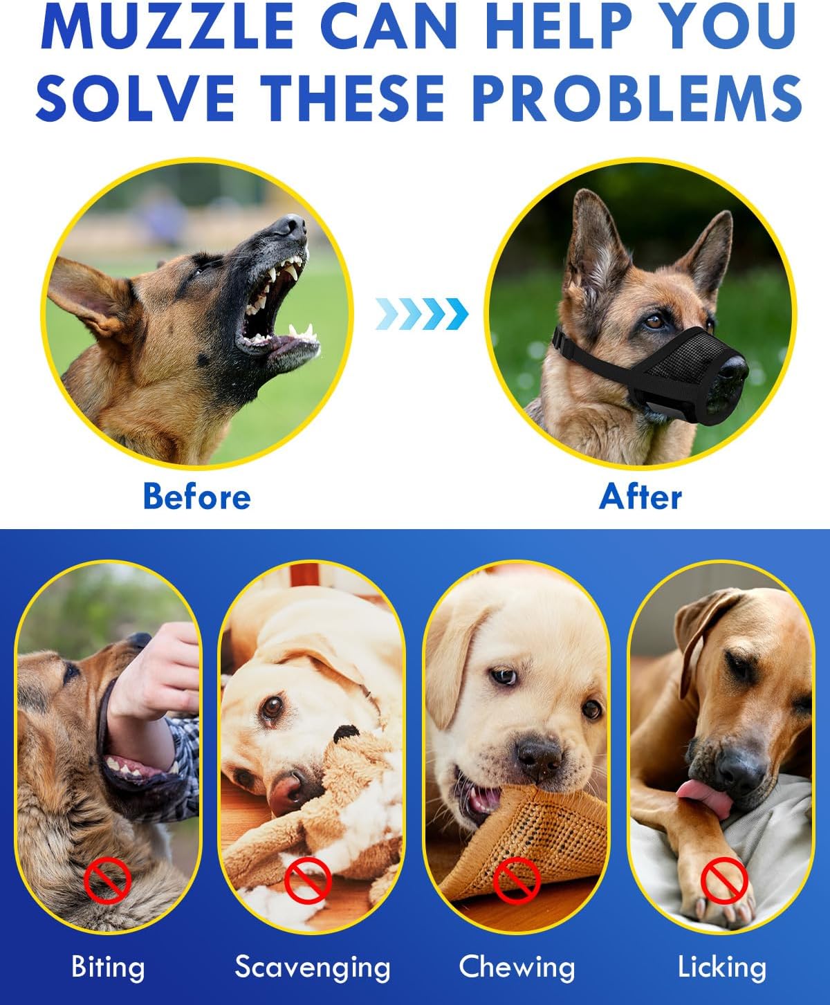 - ULTRA-BREATHABLE MESH MUZZLE: Made of premium mesh, our mesh dog muzzle is soft but still resistant and durable. The newly upgraded ultra-breathable mesh design allows your dogs to breathe freely and feel more comfortable wearing it. Extra soft padding can protect the front of your dog's nose from rubbing and is more skin-friendly. With this humane muzzle on, your dog can breathe naturally, drink water, and be active while protecting him/her from scavenging