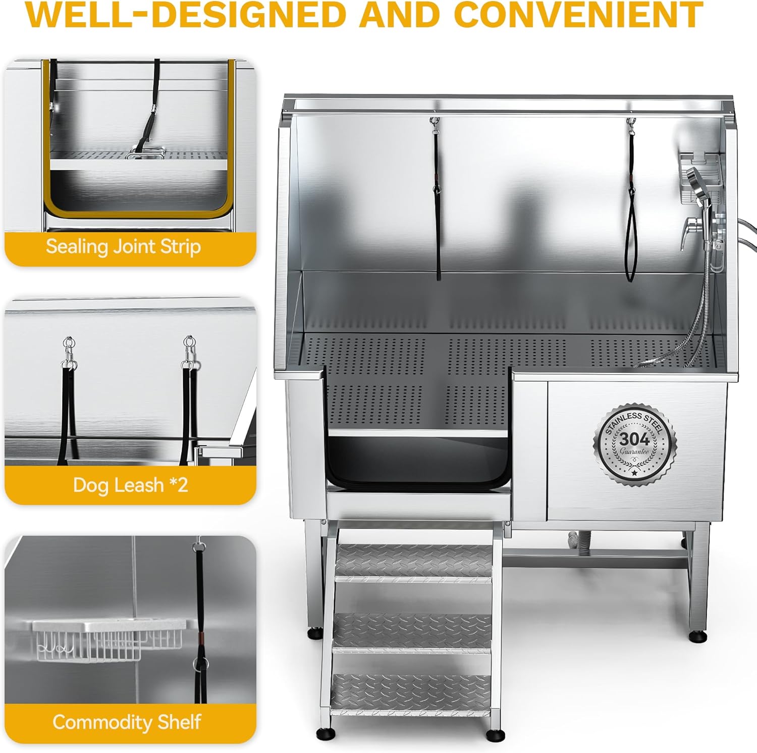 - Durable 304 Stainless Steel Tub Body: With a 330 lb weight capacity, this pet bathtub is built for long-lasting use; The fully welded, one-piece design prevents leaks, while the smooth surface allows for easy cleaning and maintenance