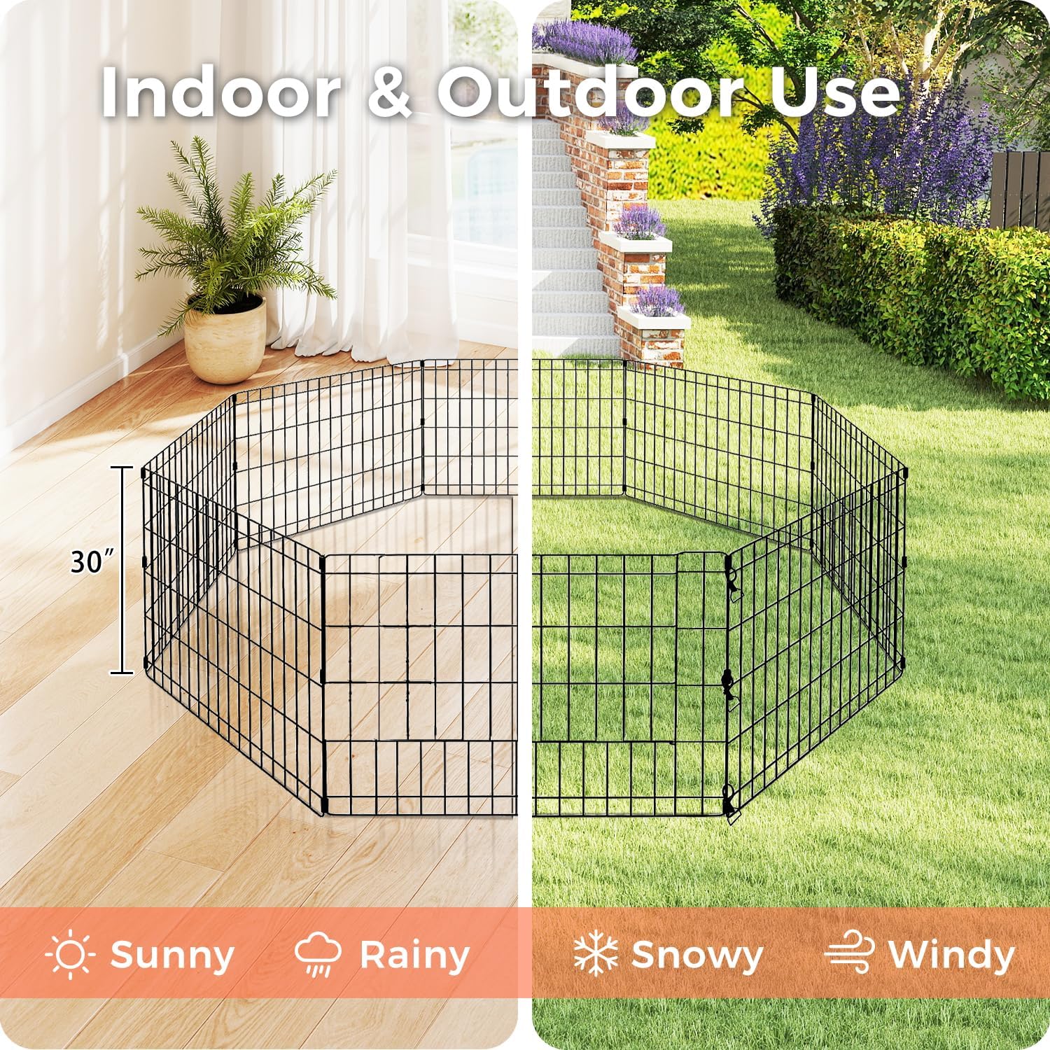 - Indoor/Outdoor Use: Constructed with rust-proof metal, this dog playpen outdoor withstands rain/snow/sun. Use as dog playpen indoor with rugs/mats, or secure with stakes as sturdy dog fence for yards/RV camping/patios.