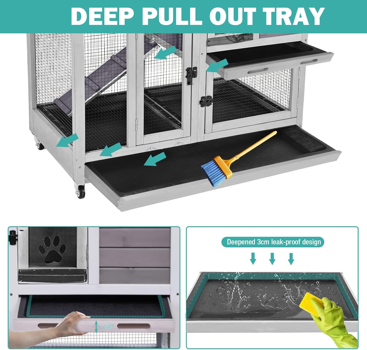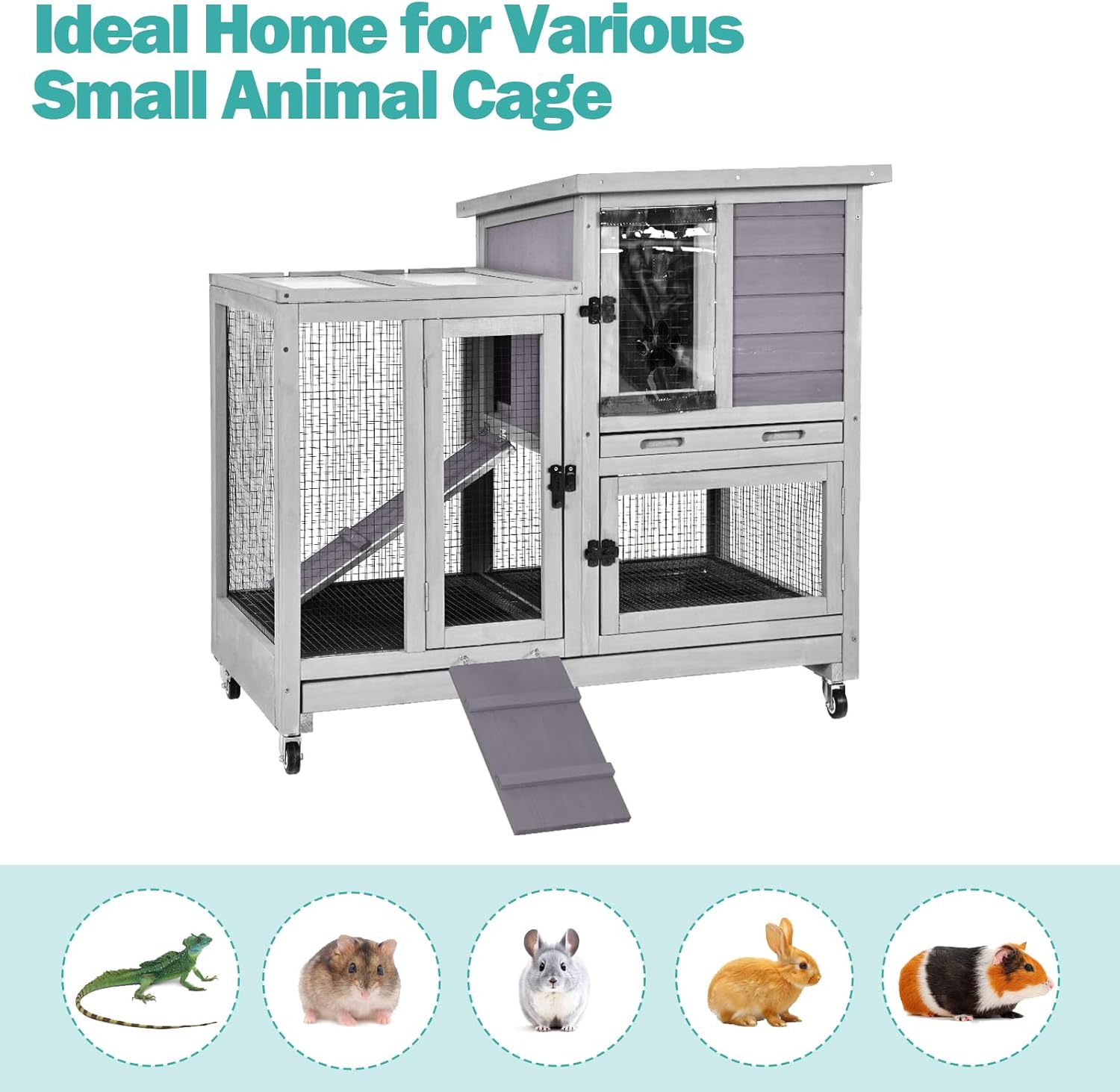 - Effortless Cleaning & Accessibility: Both levels feature slide-out plastic trays for quick waste removal, while the foldable front door, removable roof, and 4 full-access doors let you easily interact with pets, refill food, or clean every corner without hassle