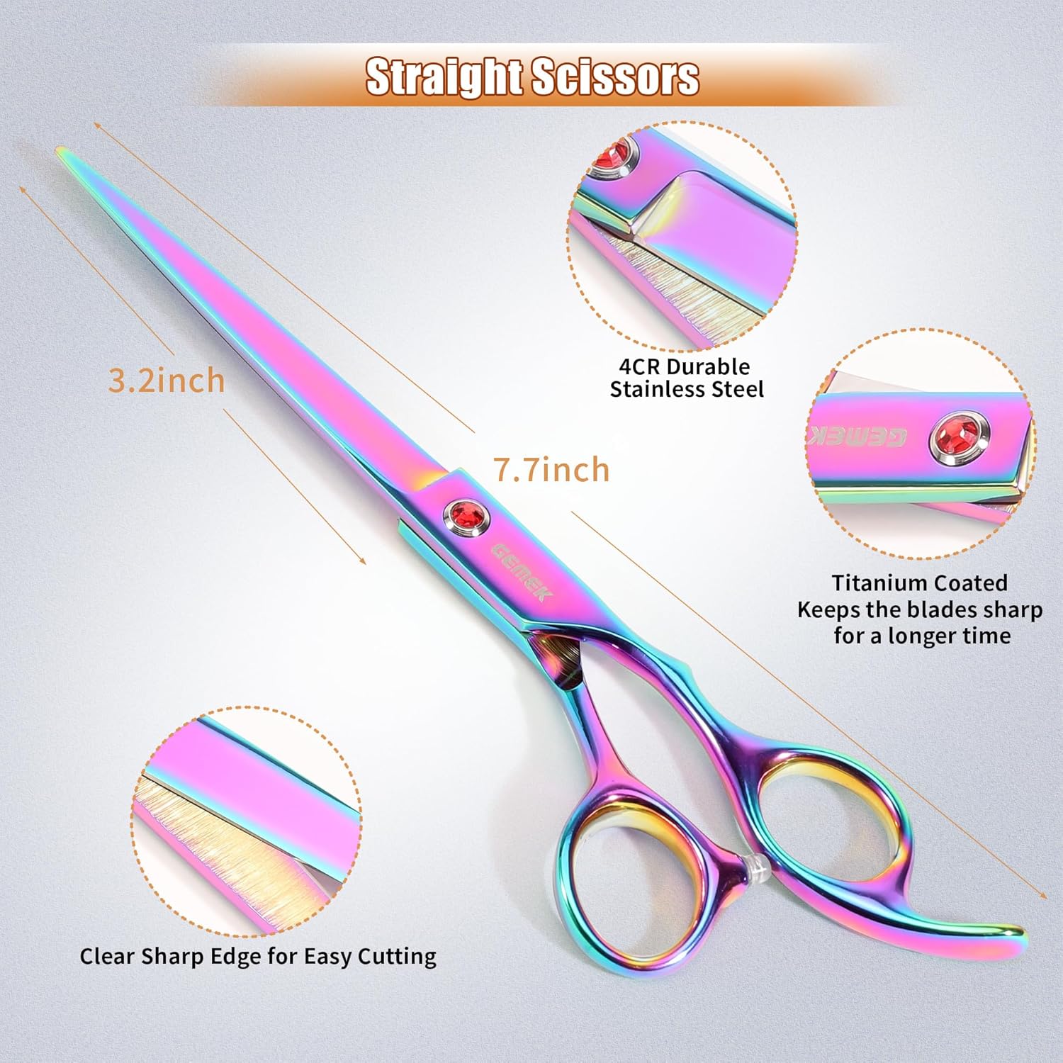 7.0in Titanium Professional Pet Grooming Scissors Set, GEMEK 6 in 1 Straight & Thinning & Upwards Curved & Downwards Curved Scissors & Comb for Dogs, Cats (Rainbow)