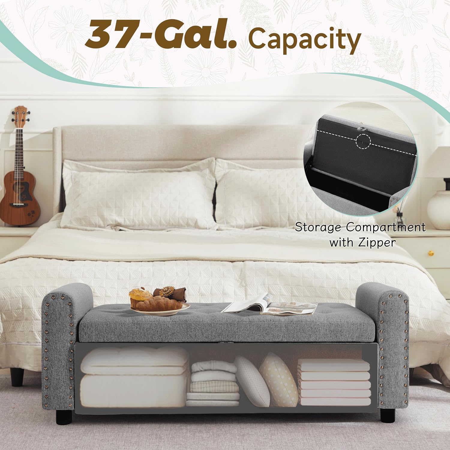 Ottoman with Storage, Tufted Storage Bench for Bedroom, 48" Fabrics End of Bed Bench, Upholstered Entryway Shoe Benches with Rolled Arm & Inner Zipper, Window Ottomans Chest with Rivets, Drak Grey